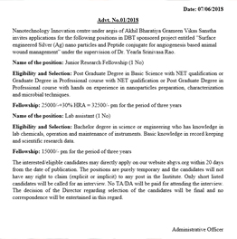 Nanotechnology Innovation centre under aegis of Akhil Bharatiya Grameen Vikas Sanstha invites applications for the following positions in DBT sponsored project entitled “Surface engineered Silver (Ag) nano particles and Peptide conjugate for angiogenesis based animal wound management” under the supervision of Dr. Yearla Srinivasa Rao.